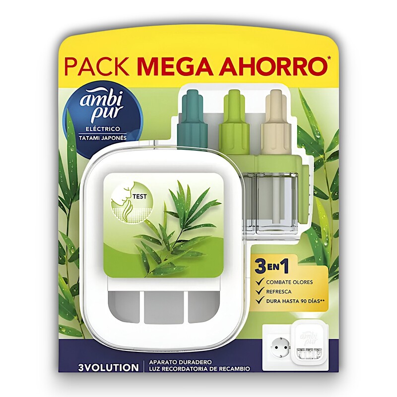 El Pack Ambi-Pur Eléctrico Tatami Japonés transforma tu hogar en un espacio de bienestar y armonía inspirado en la tradición japonesa. Gracias a su tecnología exclusiva OdourClear, elimina los malos olores de forma eficaz y continua, sin enmascararlos, dejando un aroma fresco, limpio y elegante en todo momento.