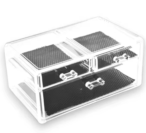 Organizador compacto y elegante de acrílico transparente, ideal para mantener tus productos de maquillaje, joyas y accesorios perfectamente ordenados y visibles. Cuenta con múltiples compartimentos y cajones con tiradores ergonómicos, y base antideslizante con revestimiento interior en negro para mayor protección de tus artículos. Material: Acrílico transparente Color: Transparente con interior negro Dimensiones: 24 cm (ancho) x 14 cm (profundidad) x 10 cm (alto) Número de cajones: 3 (2 superiores pequeños, 1 inferior grande) Uso recomendado: Cosméticos, brochas, anillos, collares, pulseras Características adicionales: Cajones extraíbles con tiradores Base antideslizante Revestimiento interno de protección