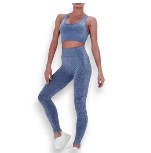 ¡Luce espectacular mientras entrenas! Este conjunto deportivo de dos piezas está diseñado para ofrecerte comodidad, soporte y estilo en cada movimiento. Características: Diseño de alto rendimiento: Sujetador deportivo con escote redondo y espalda racerback para máximo soporte y libertad de movimiento. Pantalón largo de talle alto: Realza tu figura y proporciona una sujeción firme en la zona abdominal. Tejido elástico y transpirable: Mezcla de poliéster y spandex para un ajuste ceñido y comodidad durante el ejercicio. Costuras planas: Evitan rozaduras, ideal para entrenamientos intensos. Color Azul: Un tono elegante y moderno que resalta tu estilo. Ideal para: Yoga, gimnasio, running o uso casual.