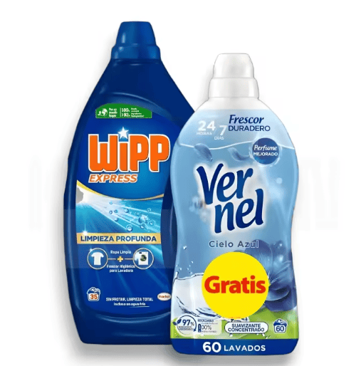 Pack Wipp Express Limpio y Liso 35 Lavados + Suavizante Vernel Cielo Azul 60 Lavados Llévate el combo ideal para cuidar tu ropa: Wipp Express Limpio y Liso (35 Lavados): Detergente líquido con fórmula de limpieza profunda que elimina manchas difíciles y deja la ropa visiblemente limpia y cuidada. Vernel Cielo Azul (60 Lavados): Suavizante concentrado con perfume mejorado y frescor duradero hasta 24 horas, dejando las prendas suaves y con un agradable aroma a limpio. Pack práctico y eficiente, pensado para obtener resultados profesionales en el lavado diario.