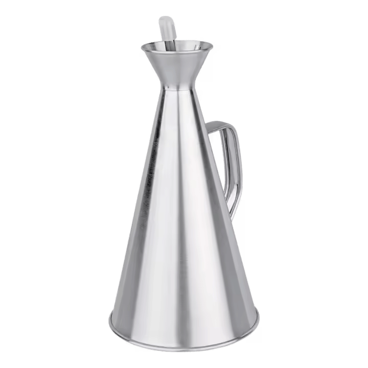 Aceitera De Acero Inoxidable 500 Ml – Diseño Elegante Con Asa Y Sistema Antigoteo, Ideal Para Cocina Moderna Disfruta De Precisión, Estilo Y Comodidad Al Servir Con La Aceitera De Acero Inoxidable De 500 Ml, un accesorio imprescindible para quienes buscan funcionalidad y elegancia en cada detalle de su cocina. Esta aceitera combina un diseño sofisticado con materiales de alta calidad y un sistema antigoteo que evita derrames y goteos, manteniendo tu cocina limpia y ordenada en todo momento. Diseño Cónico Con Asa Ergonómica: Fabricada en acero inoxidable pulido, su diseño moderno con acabado brillante aporta un toque decorativo a cualquier mesa o encimera. Su asa resistente permite un agarre cómodo y seguro, ideal para el uso diario tanto en el hogar como en entornos profesionales. Sistema Antigoteo Para Un Vertido Preciso Y Limpio: Su boquilla estrecha asegura un control exacto del flujo del aceite, perfecto para aliñar ensaladas, cocinar o servir directamente en la mesa. La tapa protectora mantiene el contenido fresco y libre de contaminación externa. Apta Para Lavavajillas Y Fácil De Limpiar: Gracias a su superficie lisa y resistente a la corrosión, esta aceitera se limpia fácilmente y es apta para lavavajillas, garantizando una higiene completa sin esfuerzo adicional. Características Principales: Capacidad: 500 ml Material: Acero inoxidable de alta calidad y larga durabilidad Sistema: Antigoteo con tapa protectora integrada Diseño: Cónico con asa ergonómica para mayor control Uso: Ideal para aceite de oliva, vinagre y otros líquidos Limpieza: Apta para lavavajillas Dimensiones Y Peso: Altura: 23.5 cm Diámetro de la base: 11.5 cm Peso: 260 g aprox. Una Solución Elegante Y Funcional Para Tu Cocina – La Aceitera De 500 Ml Que Une Diseño Moderno Con Rendimiento Profesional.