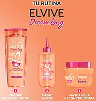El Champú L'Oréal Elvive Dream Long Reconstructor está formulado especialmente para el cuidado del cabello largo, débil o dañado. Su fórmula con keratina vegetal y aceite de ricino nutre y fortalece la fibra capilar, ayudando a reducir la rotura y reparar el daño desde la raíz hasta las puntas.
