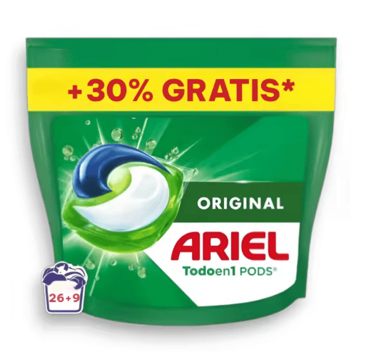 Limpieza profunda, eliminación de manchas y frescura duradera El Detergente Ariel Todo en Uno Pods 26+9 es la opción perfecta para quienes buscan una limpieza eficaz y eliminación de manchas difíciles en un solo paso. Con su fórmula avanzada, estas cápsulas eliminan manchas persistentes y combaten los malos olores, dejando tu ropa limpia, fresca y con un agradable aroma duradero. Además, el pack 26+9 te ofrece 9 cápsulas gratis, garantizando más lavados y mejor rendimiento. Características destacadas: 26+9 Cápsulas: Pack de 35 cápsulas que incluye 9 cápsulas gratis para más lavados a un precio excelente. Todo en Uno: Limpieza profunda, eliminación de manchas y protección contra malos olores. Elimina manchas difíciles: Actúa sobre manchas de grasa, vino, café y otros residuos difíciles. Control de malos olores: Combate los olores desagradables, dejando una frescura duradera en tus prendas. Fórmula rápida y eficaz: Se disuelve rápidamente, proporcionando limpieza incluso en ciclos cortos. El Ariel Todo en Uno Pods 26+9 es ideal para quienes buscan comodidad, eficiencia y frescura prolongada en cada lavado.
