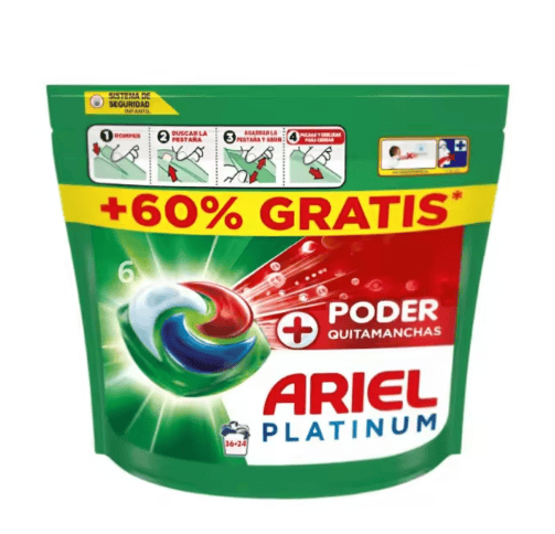 Detergente Ariel Platinum 36 + 24 Lavados — Poder Quitamanchas Detergente líquido Ariel Platinum con fórmula avanzada de poder quitamanchas, diseñado para eliminar incluso las manchas más difíciles desde el primer lavado. Pack ahorro con un total de 60 lavados (36 + 24 de regalo), ideal para uso diario en ropa blanca y de color. Ofrece limpieza profunda, frescura duradera y cuidado de los tejidos, funcionando de manera eficaz incluso en lavados a baja temperatura.
