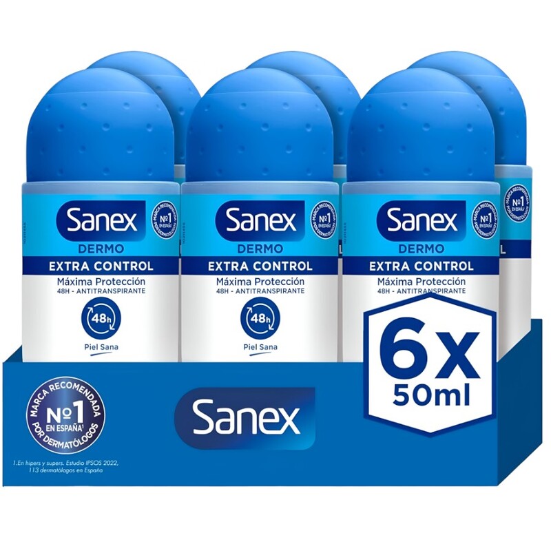 Descripción del Producto – Sanex 6 unidades DERMO Extra control Maxima Proteccion Roll-On 48H Antitranspirante 6 unidades El desodorante antitranspirante roll-on Sanex Dermo Extra Control 48H es la solución ideal para hombres que buscan protección duradera contra el sudor y el mal olor sin sacrificar el confort de la piel. Su fórmula avanzada está específicamente diseñada para piel masculina, ofreciendo una protección eficaz hasta 48 horas, manteniendo las axilas secaras, frescas y sin irritación incluso en días intensos. Protección antitranspirante 48H contra el sudor y el mal olor — ideal para uso diario, deporte o jornadas largas. Fórmula suave y respetuosa con la piel, libre de alcohol etílico para minimizar irritaciones, incluso tras el afeitado. Sensación de frescor duradera con efecto seca que ayuda a mantener la higiene corporal. Eficaz control de la sudoración, ayudando a prevenir manchas en la ropa y cuidando la piel de las axilas. Aplicación roll-on práctica y precisa que desliza suavemente, garantizando una distribución uniforme. Medidas y Especificaciones Exactas Contenido: 50 ml de producto por unidad (formato roll-on). Dimensiones aproximadas del envase: Altura: ~9 mc Diámetro: ~4mc Ancho: ~9 mc (estas medidas se basan en datos de producto estándar de 50 ml). Peso unitario: ~380 g con embalaje (pack individual).