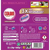 Colon Detergente Cápsulas, 32 Unidades – 3X Poder Quita Manchas, Limpieza Profunda y Frescor Duradero Colon PowerCaps es la solución perfecta para mantener tu ropa limpia y fresca. Este innovador detergente en cápsulas de 32 unidades proporciona una limpieza profunda y elimina las manchas más difíciles, gracias a su fórmula avanzada con 3X Poder Quita Manchas. Asegura una disolución rápida sin dejar residuos, lo que lo convierte en la opción ideal para tu colada diaria, tanto en agua fría como caliente. Con un diseño que reduce el uso de plásticos en su empaque en un 60%, Colon PowerCaps ofrece una opción más amigable con el medio ambiente sin comprometer su efectividad. El aroma fresco y duradero que deja en tu ropa garantizará que disfrutes de prendas limpias con un toque de frescura.