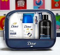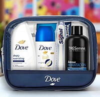 El neceser de viaje Dove para mujer reúne 5 imprescindibles de cuidado personal en un práctico formato: gel de ducha Deeply Nourishing, desodorante Dove Original, crema corporal, champú TRESemmé Hidratación Intensa, cepillo de dientes y pasta Signal White Now. Ideal para mantener tu rutina de cuidado y frescura donde quiera que vayas.