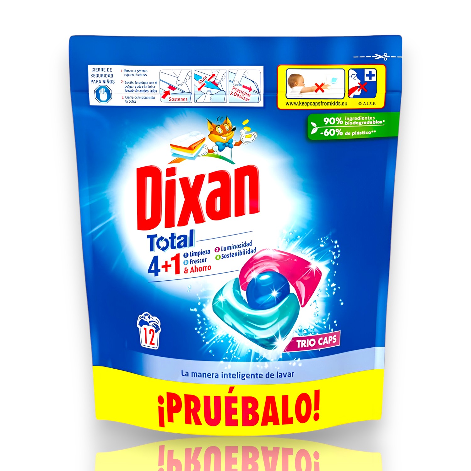 Detergente En Cápsulas Dixan Total 4+1 Trio Caps – 12 Cápsulas – Limpieza Profunda, Cuidado Del Color Y Frescor Inigualable Limpieza Profesional Con Cada Lavado Descubre el Detergente Líquido En Cápsulas Dixan Total 4+1 Trio Caps, una solución innovadora que combina máxima eficacia de limpieza, cuidado del color y frescura duradera. Gracias a su tecnología avanzada antitransferencia de colores, podrás mezclar ropa sin preocuparte por las manchas o desteñidos. Fórmula 4 En 1: Poder Que Se Nota Cada cápsula contiene una poderosa fórmula 4 en 1 que garantiza: Limpieza Profunda, incluso en las manchas más difíciles. Protección del Color, evitando la transferencia entre prendas. Luminosidad Brillante, que realza el blanco y los colores. Frescor Duradero, que deja tu ropa impecablemente perfumada. Comodidad En Cada Lavado Diseñadas para ofrecerte máxima practicidad, estas cápsulas ya vienen pre-dosificadas, listas para usar directamente en el tambor de la lavadora. ¡Sin derrames, sin esfuerzo, solo resultados impecables! Ideal Para Todo Tipo De Ropa Y Temperaturas Las cápsulas Dixan Total 4+1 funcionan eficazmente en ciclos de lavado desde 20°C, ayudando a ahorrar energía sin comprometer la limpieza. Apto para ropa blanca y de color. Contenido Del Producto Cantidad: 12 cápsulas monodosis Formato: Pack compacto, ideal para almacenaje Dimensiones Y Peso Dimensiones del paquete: 19 cm (Largo) x 14 cm (Ancho) x 5 cm (Alto) Peso neto: 264 g aprox. Palabras Clave SEO Incluidas Detergente en cápsulas, cápsulas para lavadora, Dixan Total, detergente líquido ropa color, limpieza profunda, antitransferencia de color, cápsulas Dixan, detergente con frescor, detergente para ropa blanca y color, cápsulas lavadora ropa limpia. Dixan Total 4+1 Trio Caps es la elección perfecta para quienes buscan una limpieza eficaz, protección del color y frescura prolongada, todo en una sola cápsula. ¡Haz de tu colada una experiencia superior!