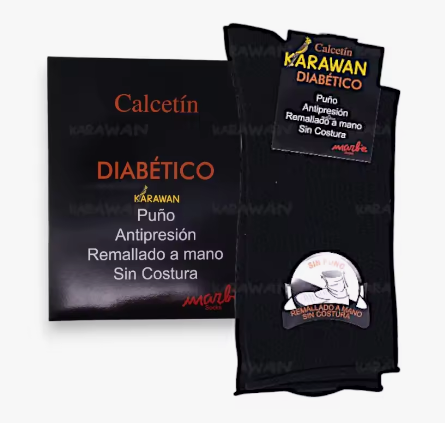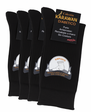 Calcetín diabético en talla única, color negro. Sin costuras, remallado a mano y puño antipresión. Ideal para personas con pies sensibles o con diabetes.