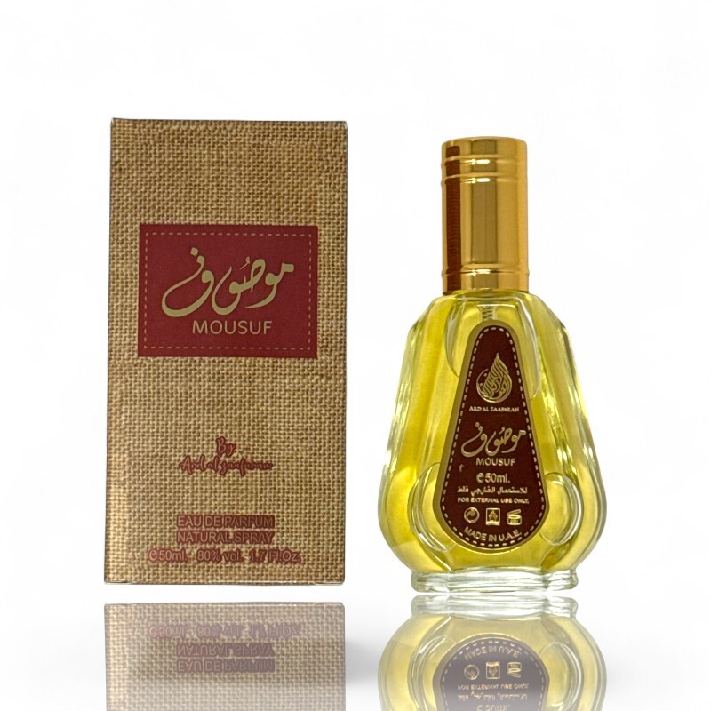 Perfume árabe Mousuf de Ard Al Zafaran (50 mL). Fragancia dulce, especiada y amaderada, con excelente duración y presencia. Un Eau de Parfum elegante y envolvente para cualquier ocasión.