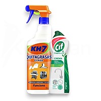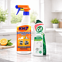 Set De Limpieza Para Cocina Y Superficies Kh-7 Quitagrasas Cítrico Spray 715 ml + Cif Cleanboost Crema 250 ml El Set De Limpieza Kh-7 Quitagrasas Cítrico 715 ml + Cif Cleanboost Crema 250 ml es una combinación práctica pensada para facilitar las tareas de limpieza diaria en el hogar. Este conjunto reúne dos productos conocidos por su versatilidad para el cuidado de distintas superficies de la cocina y otras áreas de la casa. El KH-7 Quitagrasas Cítrico en formato spray de 715 ml está diseñado para ayudar en la limpieza de restos de grasa y suciedad en diferentes superficies. Su formato pulverizador permite aplicar el producto de forma cómoda y dirigida, lo que facilita su uso en zonas como encimeras, campanas extractoras, hornos, parrillas o utensilios de cocina. Por su parte, Cif Cleanboost Crema 250 ml es una crema limpiadora pensada para apoyar la limpieza de superficies del hogar. Su textura cremosa facilita la aplicación con esponja o paño, ayudando a tratar zonas como fregaderos, grifos, azulejos, encimeras o superficies de baño. Este set de limpieza para cocina y hogar ofrece una solución práctica para el mantenimiento cotidiano de diferentes espacios. La combinación de spray desengrasante y crema limpiadora permite abordar distintos tipos de suciedad en superficies habituales del hogar, contribuyendo a mantener los espacios limpios y ordenados. Gracias a su formato combinado, este pack resulta útil tanto para el uso doméstico habitual como para quienes buscan contar con productos de limpieza versátiles para diferentes superficies. Características Principales ● Set de limpieza para el hogar con dos productos complementarios. ● Incluye KH-7 Quitagrasas Cítrico Spray 715 ml para limpieza de superficies con restos de grasa. ● Incluye Cif Cleanboost Crema 250 ml para limpieza de diferentes superficies del hogar. ● Formato práctico que facilita la aplicación con pulverizador y crema. ● Adecuado para uso en cocina, fregaderos, encimeras, electrodomésticos y otras superficies lavables. ● Pack pensado para el mantenimiento y limpieza cotidiana del hogar. Contenido Del Set ● 1 x KH-7 Quitagrasas Cítrico Spray 715 ml ● 1 x Cif Cleanboost Crema 250 ml Medidas Y Peso Del Empaque ● Longitud: 13 cm ● Ancho: 20 cm ● Altura: 38 cm ● Peso: 1 kg