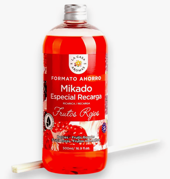 El Mikado Especial Recarga Frutos Rojos 500ml de La Casa de los Aromas es la solución perfecta para seguir disfrutando de tu ambientador de varillas favorito con un formato ahorro. Su fragancia intensa y duradera combina la dulzura y frescura de las bayas rojas con un toque vibrante que llena cada espacio de energía positiva. Ideal para salones, dormitorios, oficinas o negocios, este recambio de gran capacidad ofrece horas de difusión continua manteniendo el ambiente siempre fresco y acogedor. ✅ Beneficios principales: Fragancia intensa y duradera de frutos rojos. Formato ahorro 500ml, ideal para recargar tu mikado. Aroma afrutado y vibrante para cualquier estancia. Difusión continua con varillas (no incluidas). Producto de La Casa de los Aromas, garantía de calidad. Con el Mikado Recarga Frutos Rojos, cada rincón de tu hogar se llenará de un aroma dulce, fresco y envolvente.