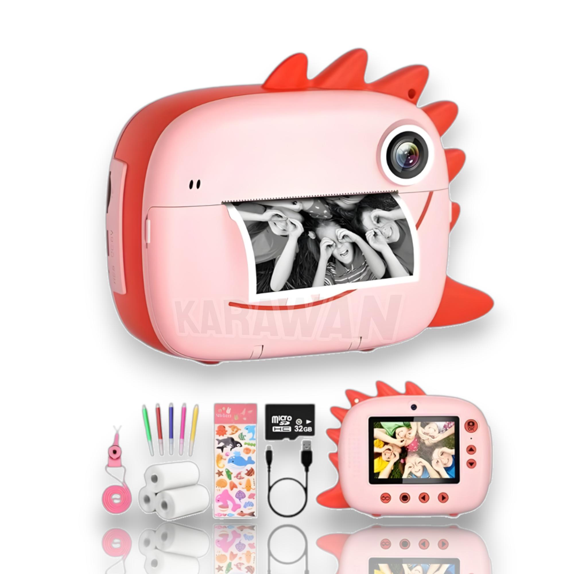 Cámara Digital Infantil Dino Rosa con impresión instantánea y pantalla a color. Incluye accesorios, memoria 32GB y rollos de papel. Ideal como regalo creativo y divertido para niños.