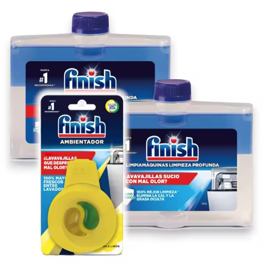 Limpieza higiénica completa y control de olores para tu lavavajillas El Pack LimpiaMáquina de Finish combina el poder del Limpiador Profundo para Lavavajillas con un Ambientador con aroma a limón, para ofrecerte una limpieza total desde el interior de tu electrodoméstico. Su fórmula con tecnología de tensoactivos elimina eficazmente la grasa, los residuos de cal y la suciedad acumulada, mientras que el ambientador mantiene tu lavavajillas fresco en cada lavado.